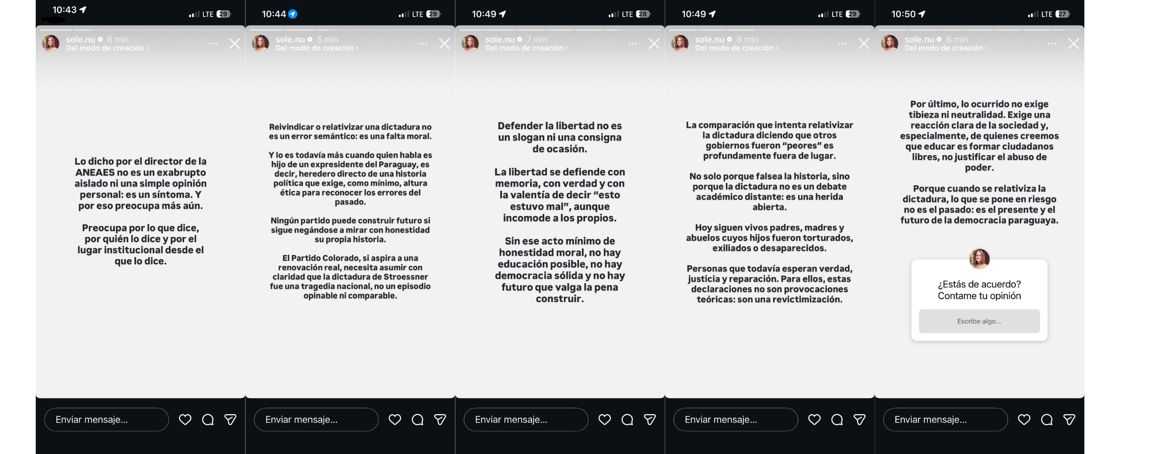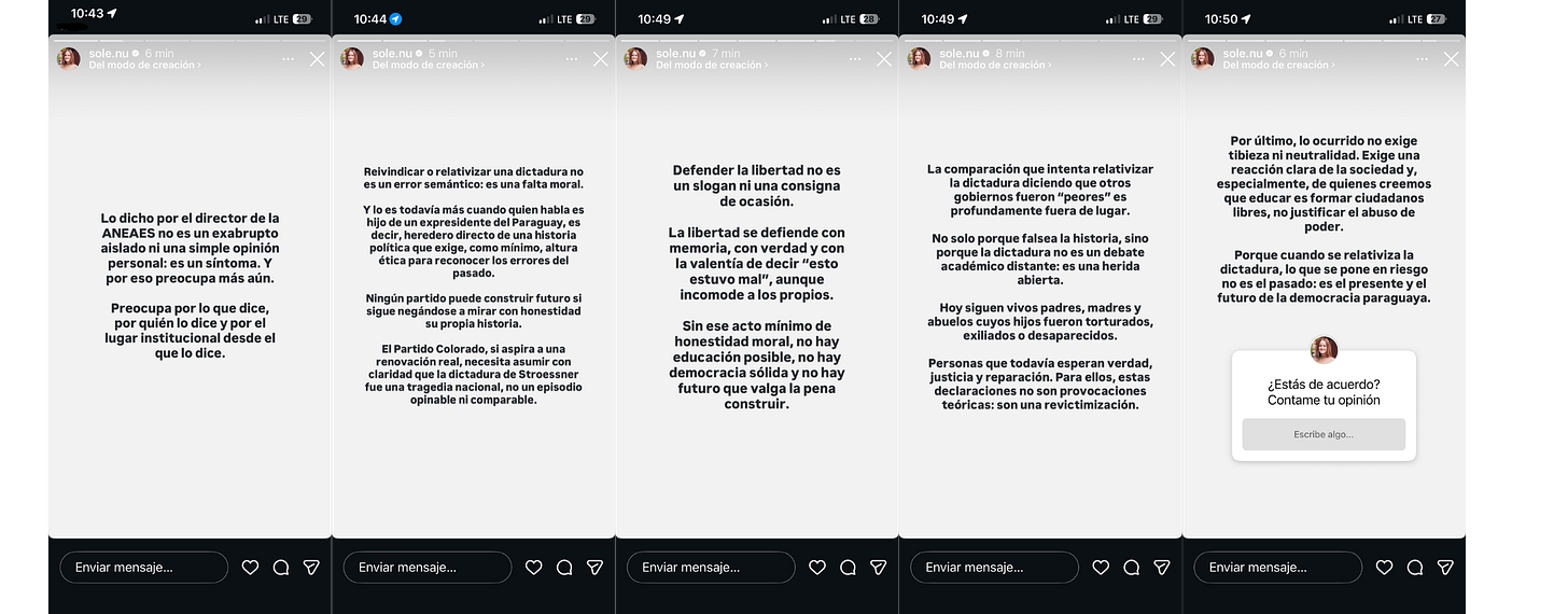 Y figuras que vienen de sectores que casi nunca, por no decir nunca, tienen a la dictadura de Stroessner o a la memoria entre sus prioridades políticas —algunos incluso con beneficiarios de dicha dictadura entre sus filas, como el caso del Partido Patria Querida— salieron con reels y comunicados condenando radicalmente los dichos del sociólogo a la caza de interacciones y posicionamiento.